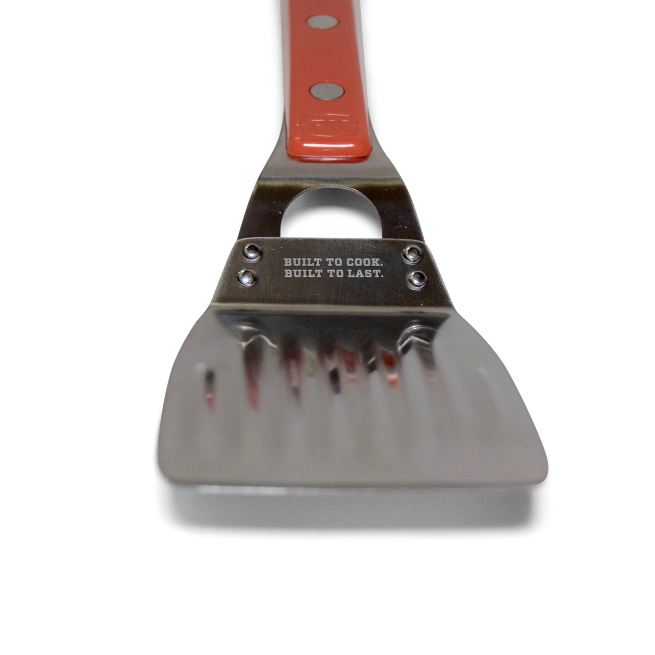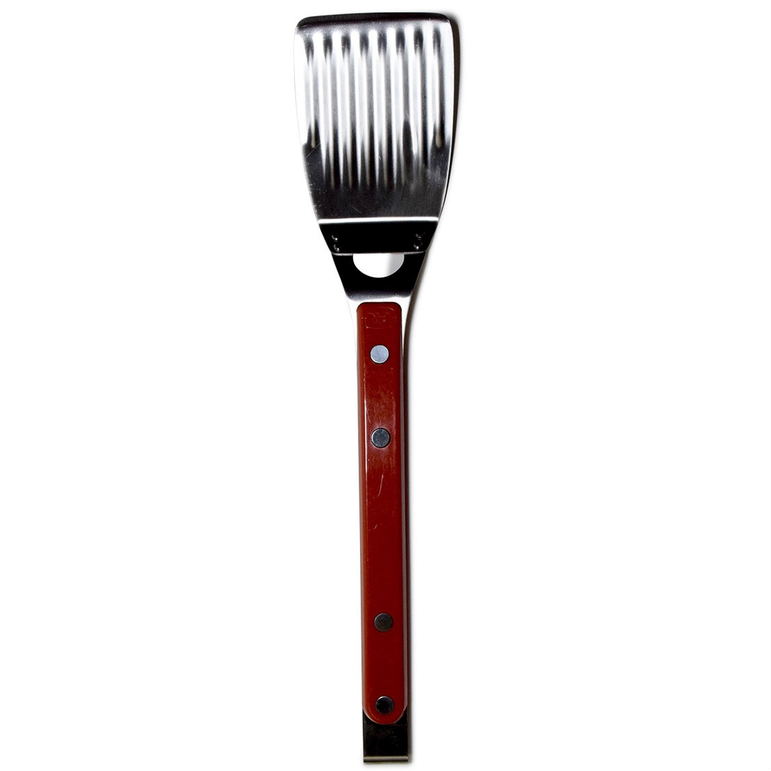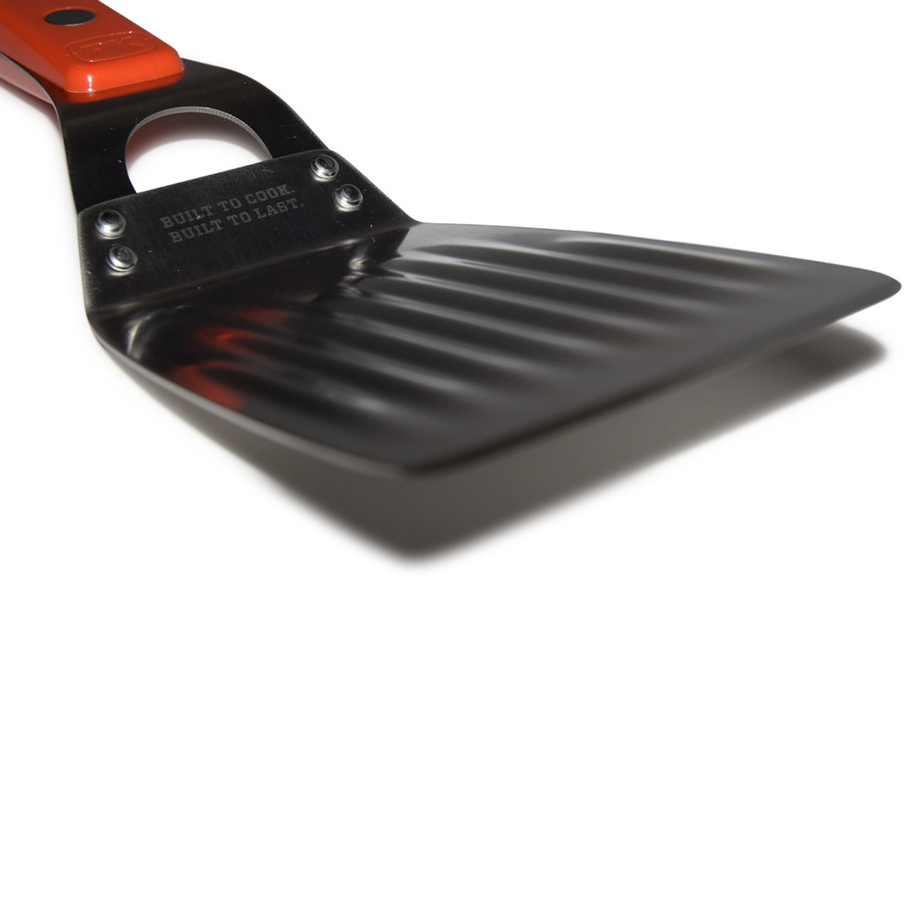 The new Stainless Steel Spatula from PK is a flipping miracle. The wide, fluted spatularium is designed to glide smoothly beneath your steak and burgers without them noticing. The elongated handle is optimized to give you the perfect wrist-pop that you need to achieve that triple chicken flip that the neighborhood kids can't get enough of. And it's stainless freaking steel, so don't be afraid to turn this bad boy sideways and bring your GI Joe machete chop down hard on your father-in-laws burger patty to show him it is well done. Yes sir, that is one well done patty. And this is one well done spatula. You are welcome.