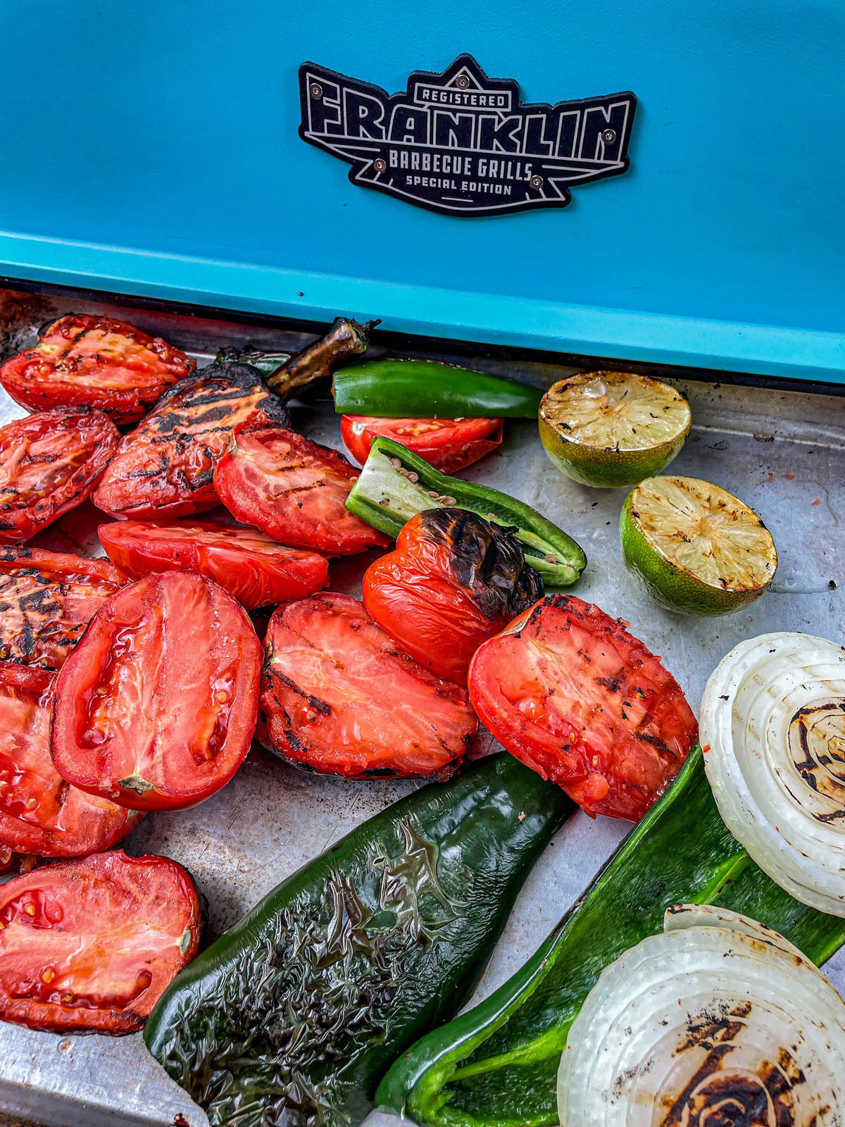 Place the tomatoes, lime, onion, and peppers over direct heat. Allow the first side to char for 3-4 minutes. Flip and let the second side char.