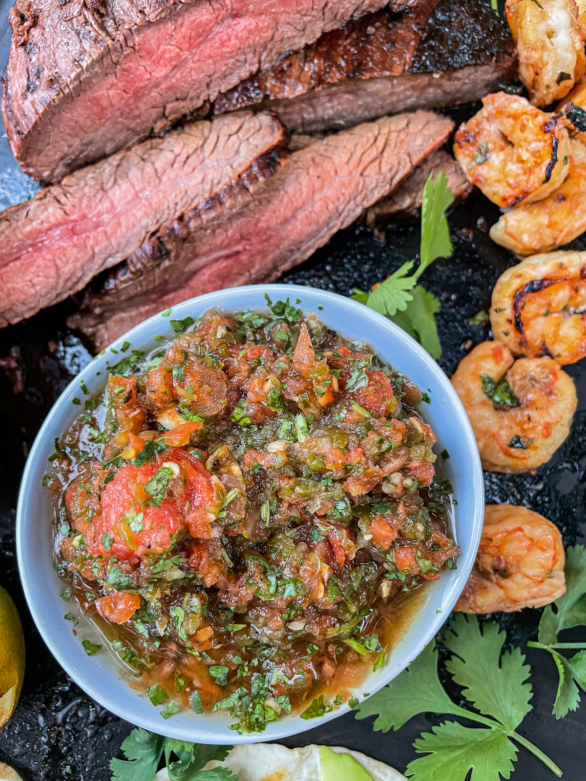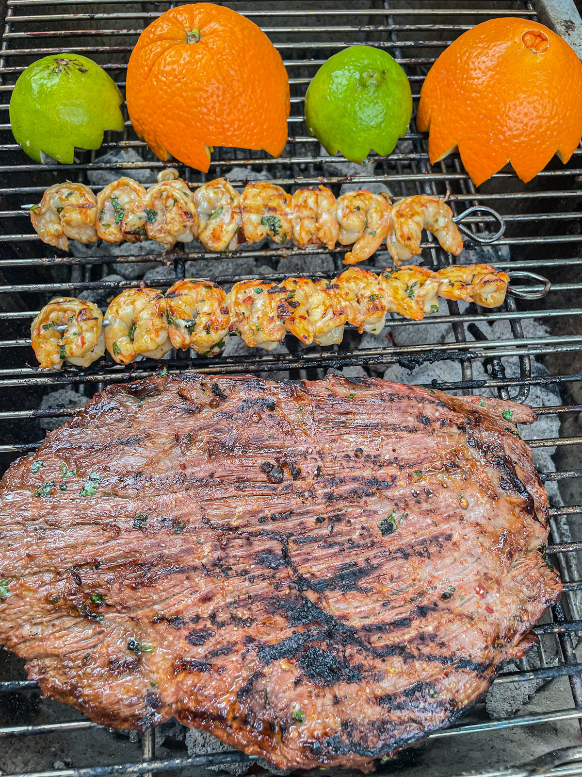 Rich flank steak and succulent sweet shrimp are marinated in a smoky, sweet, and tangy marinade that highlights both of their natural flavors. Whether you’re stuffing tortillas, topping crisp greens, or building the perfect bowl, the combination of grilled flank steak and shrimp is an instant fiesta.