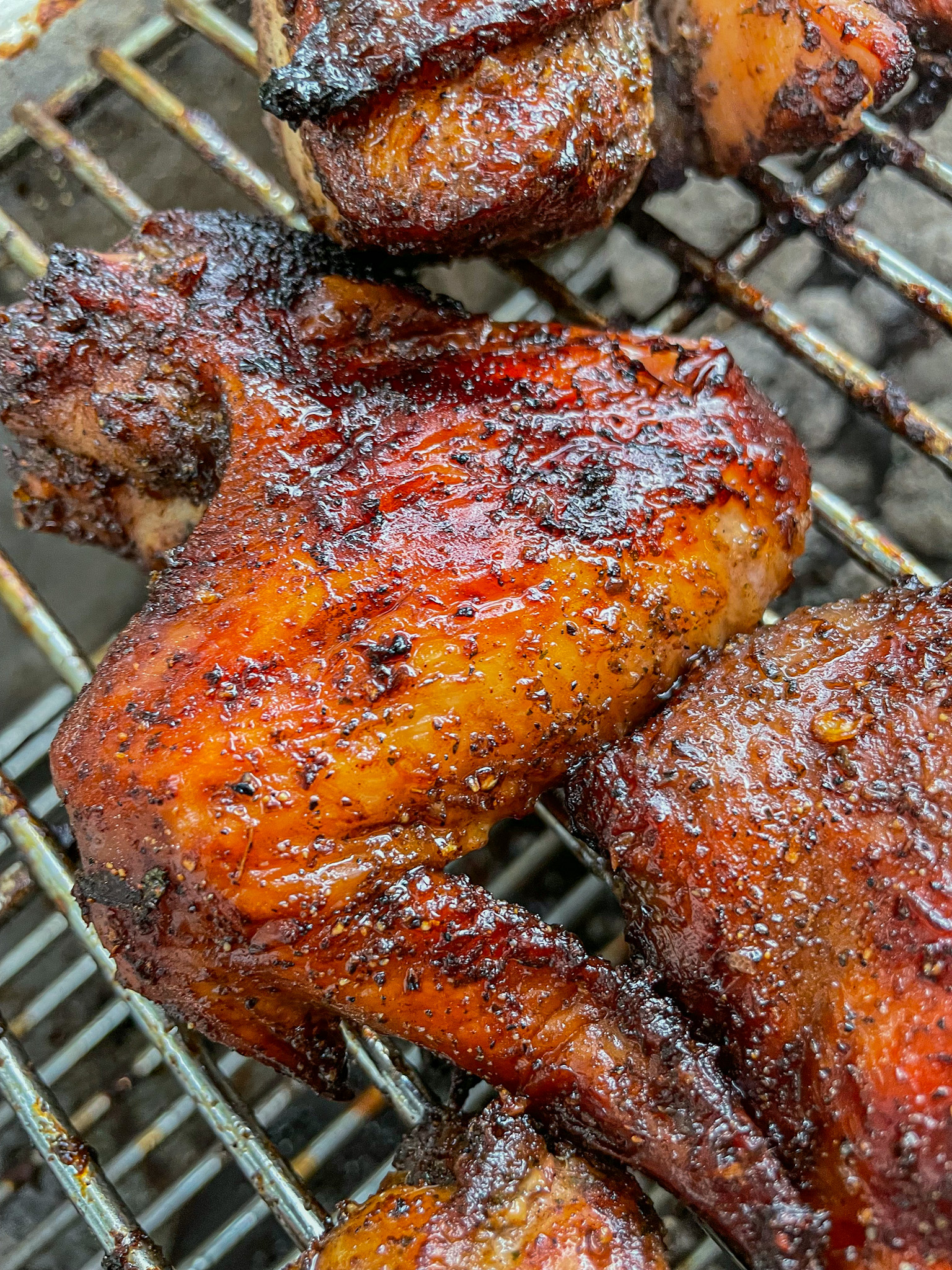 After 30 minutes flip and rotate your chicken, moving the pieces that were further away from the charcoal closer. Begin brushing your chicken with the basting liquid.