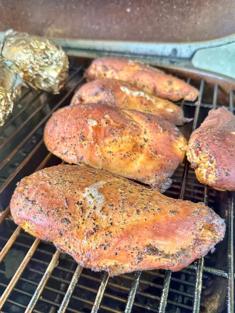 3. Have the smoker set at 250 degrees F and add the potatoes. Let them smoke for 45 minutes and then add bourbon wood chunks for smoke right before adding the chicken breast. Make sure to put the chicken breast as far from the heat source as possible.