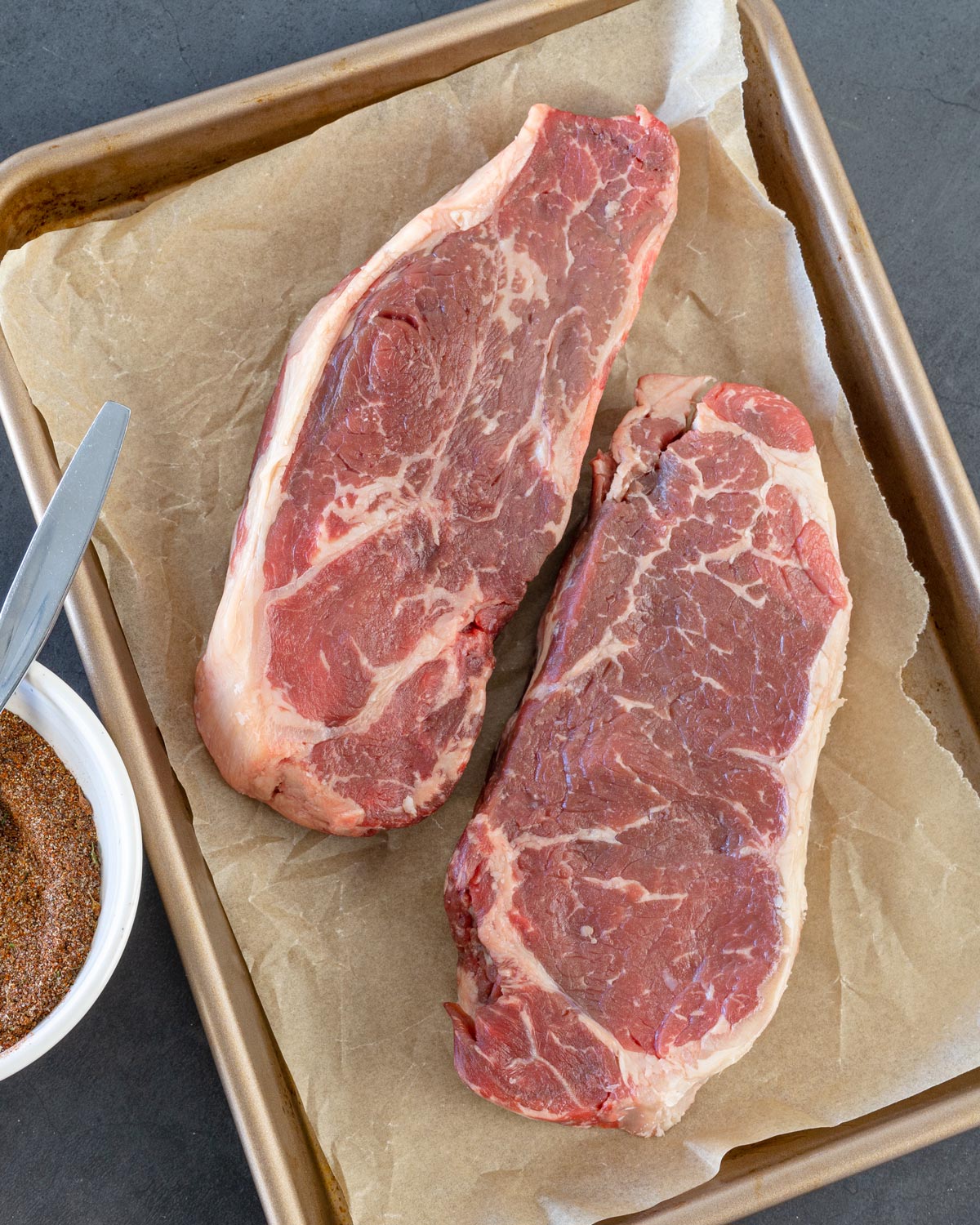 Today we’re using NY strip steaks, which has a great balance of fat and flavor without overshadowing the shrimp. Building a crispy crust on the outside adds a great contrast to the meal, which is topped with the saucy shrimp étouffée.