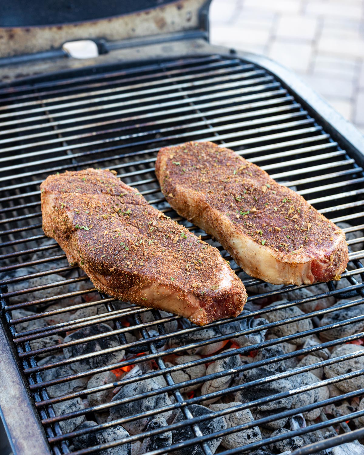 - Grill the steaks. Place the steaks on the grill and allow them to sear directly over the coals for about 30-45 seconds before flipping. Continue to flip the steaks in this way until a crust has formed. Sear off the fat cap on the side. Move the steaks to the cooler side of the grill as needed if they are cooking too quickly. Cook until they are about 10° from your target temperature, medium-rare being 130-135°F. Pull them from the grill and rest under loosely tented foil.