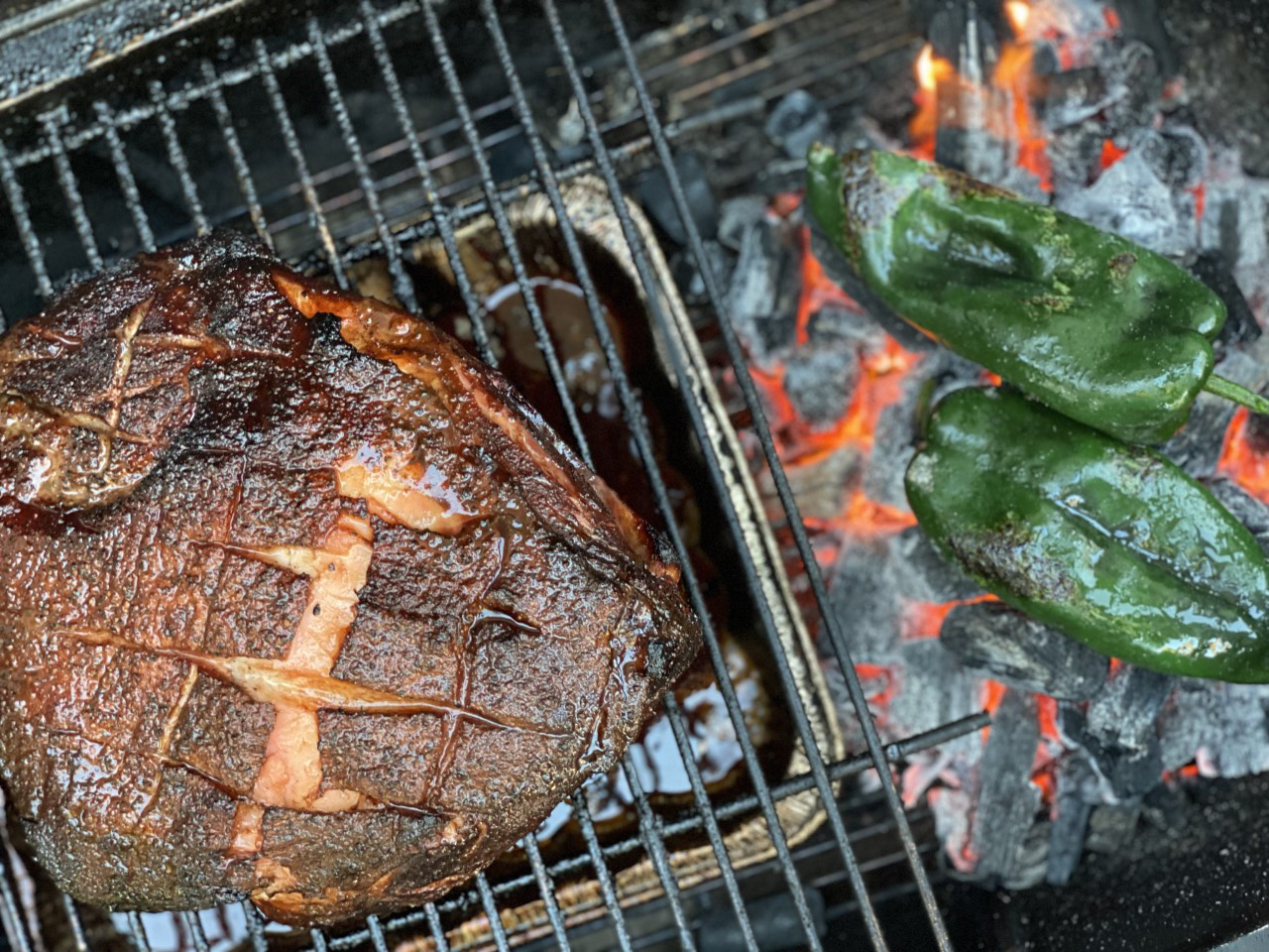 Blister Poblano Directly over the Coals, rotating periodically for even heat around the pepper. Remove from the coals and place the roasted poblanos in a ziploc or tin foil to sweat. Set aside.