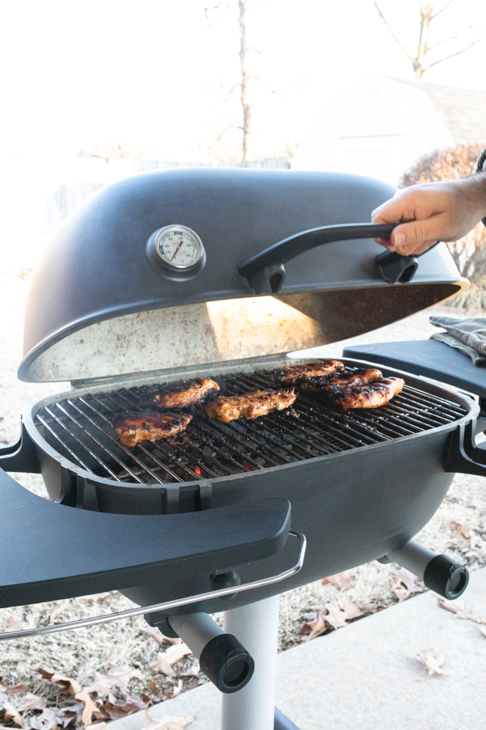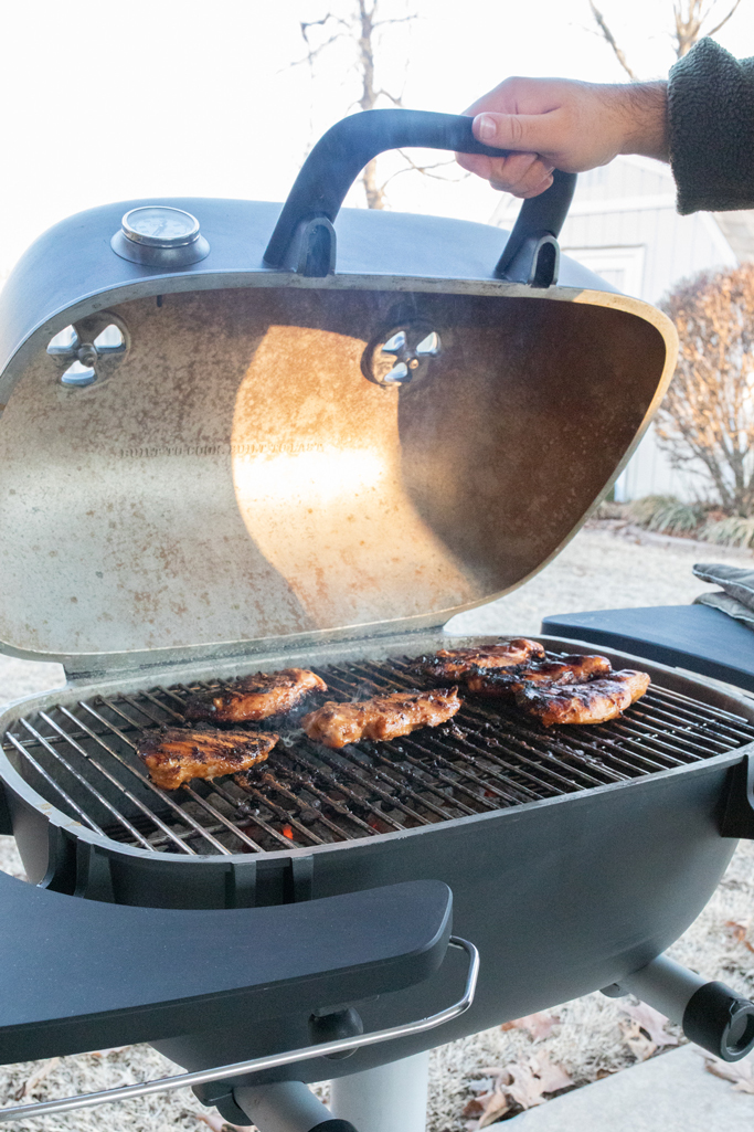 Remove chicken from marinade and pat dry. As you will be direct grilling, any water residue should be removed. Paper towels will do just fine.