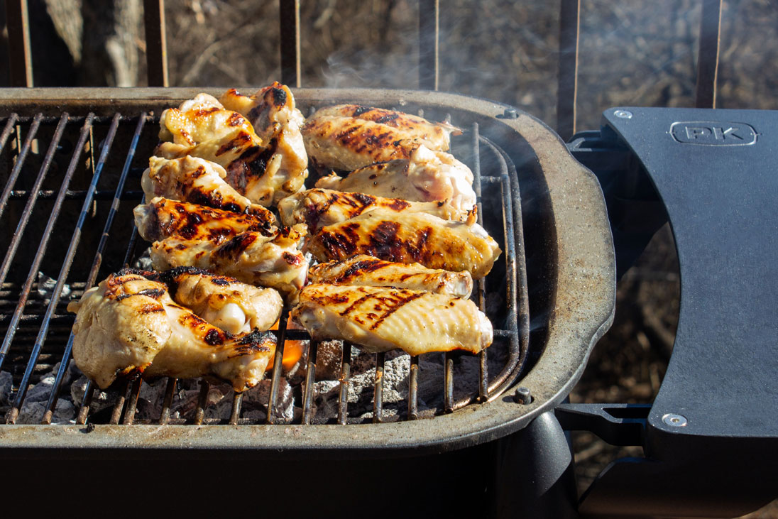 Prep PK for indirect heat with a nice bed of coals. Remove wings from brine, pat dry, and allow to rest at room temp for about 30 min to air dry a bit.* Start by grilling the wings over direct heat until nice grill marks have been established. Once cooked, move wings to the grill side opposite the coals. Place soaked chips over grates and smoke for about 30 min.
