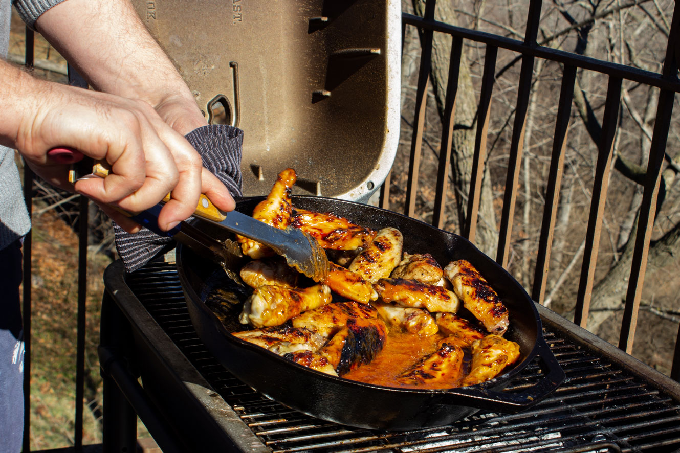 Place wings in sauce, turning to coat on all sides. Place the coated wings on all sides directly over the coal bed. Grill until the sugars begin to caramelize (but not burn). Place wings back into the sauce to coat, then serve.