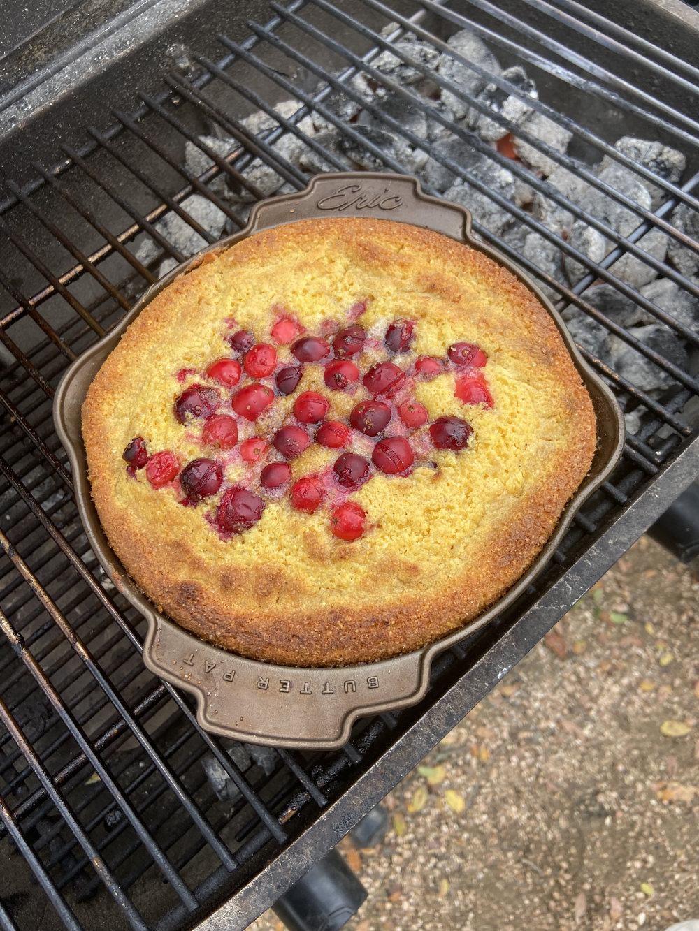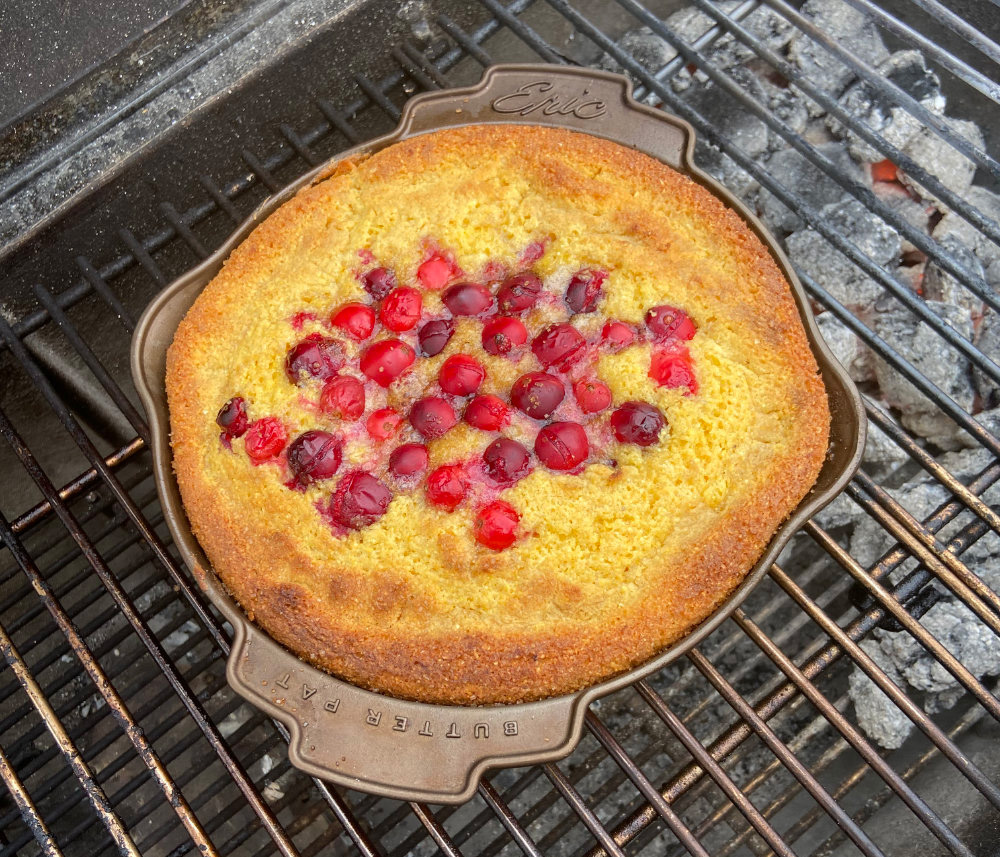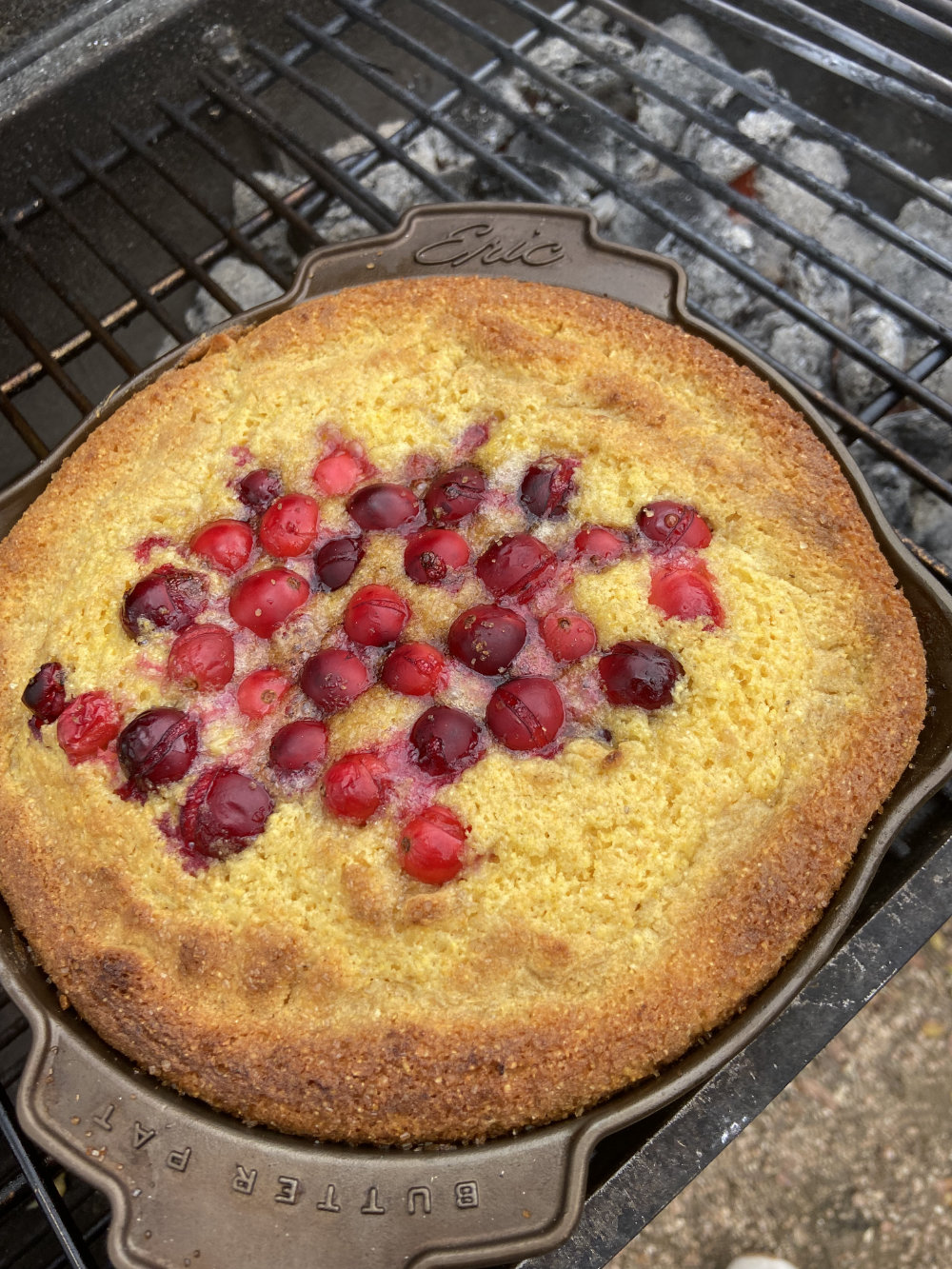 When the coals are glowing red and covered with a fine gray ash, place the skillet and remaining butter on the side of the grill with no coals, close the grill, and allow the skillet to heat for 5 minutes. Place the batter bowl, cranberries, and sugar on a rimmed baking sheet to transport to the grill. Working quickly, open the grill, use the spatula to transfer the batter to the hot skillet and smooth the top. Scatter the cranberries on top of the batter, and sprinkle with the turbinado sugar. Close the grill, vent the grill for smoking and bake for 20 minutes. Using tongs or a towel, carefully rotate the skillet 180 degrees, close the grill and bake for another 15-20 minutes (maintaining a temperature of 350 F - 375 F), or until the edges are golden brown, the top feels springy to the touch, and a toothpick inserted in the center of the cake comes out clean.