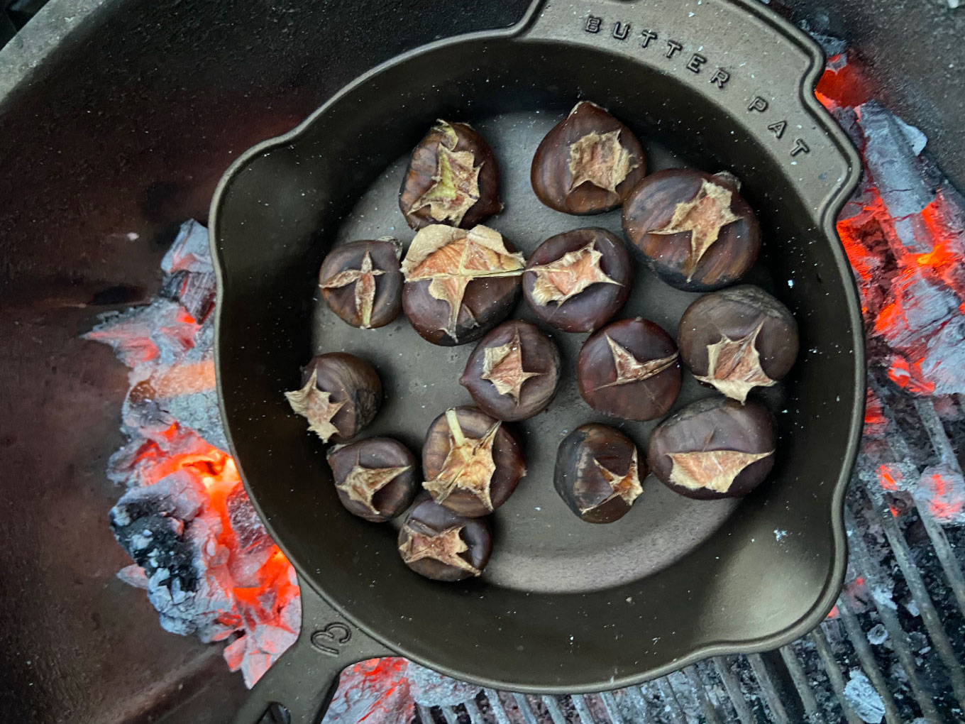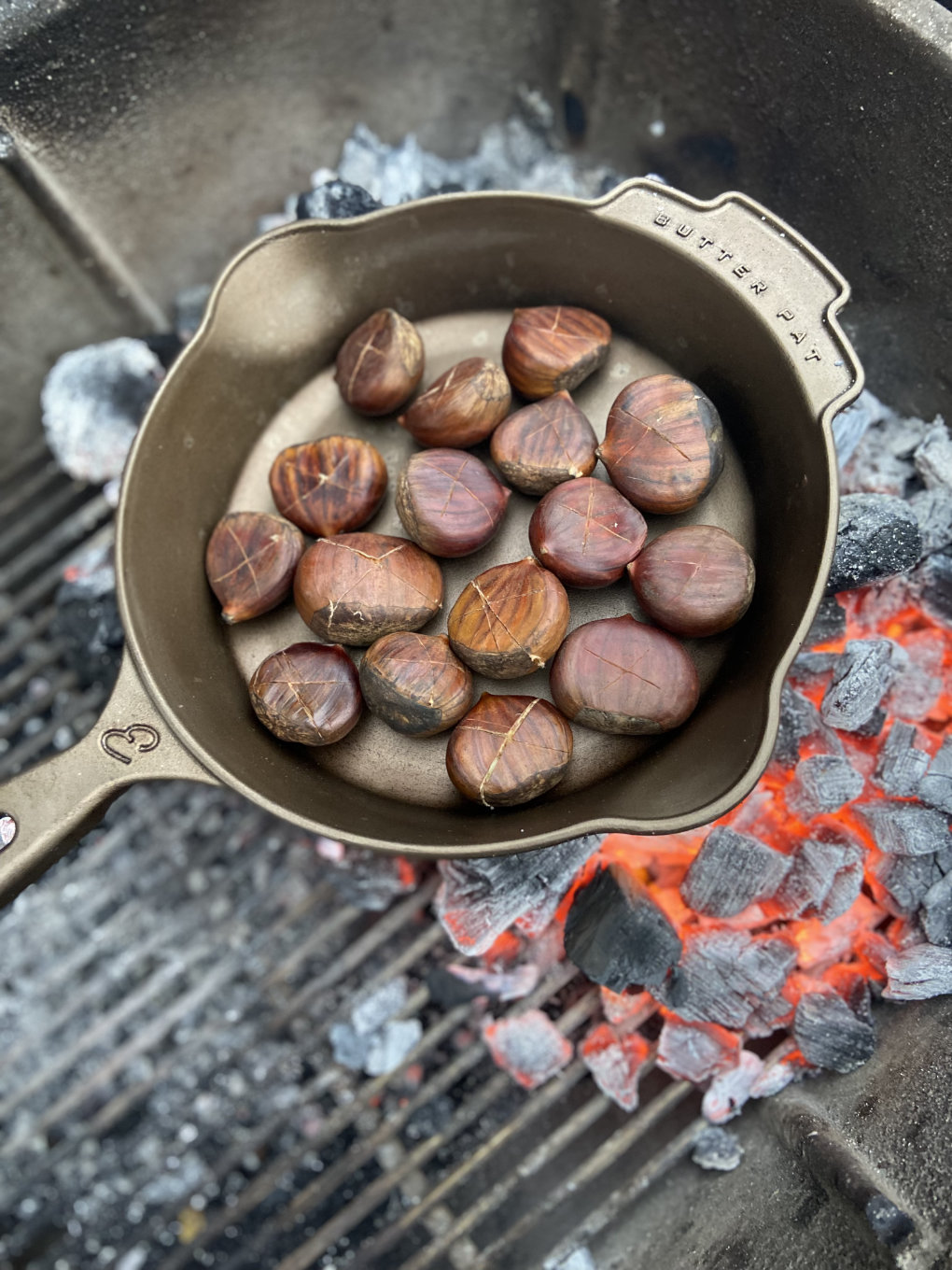 When the coals are glowing red and covered with a fine gray ash, nestle the skillet in the coals, keeping the handle extended away from the fire so it’s easier to handle. Roast the chestnuts with the grill lid open for about 5 minutes, until the shells begin to open. Then continue to roast, stirring gently every few minutes, for an additional 5-7 minutes. Rotate the skillet as needed for even cooking. The goal is cooking the nuts through till they have a tender, slightly creamy consistency without burning any one side.