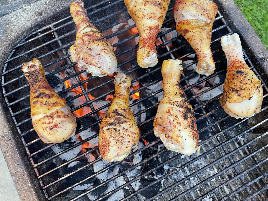Season the drumsticks with the kosher salt or your favorite chicken seasoning, then place them over the coals/direct heat.