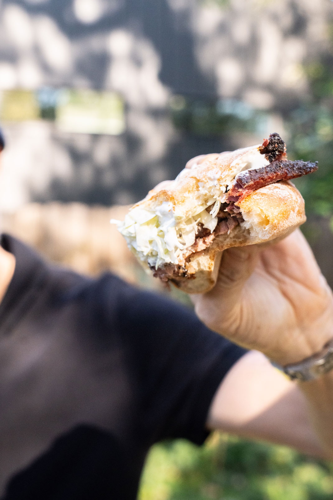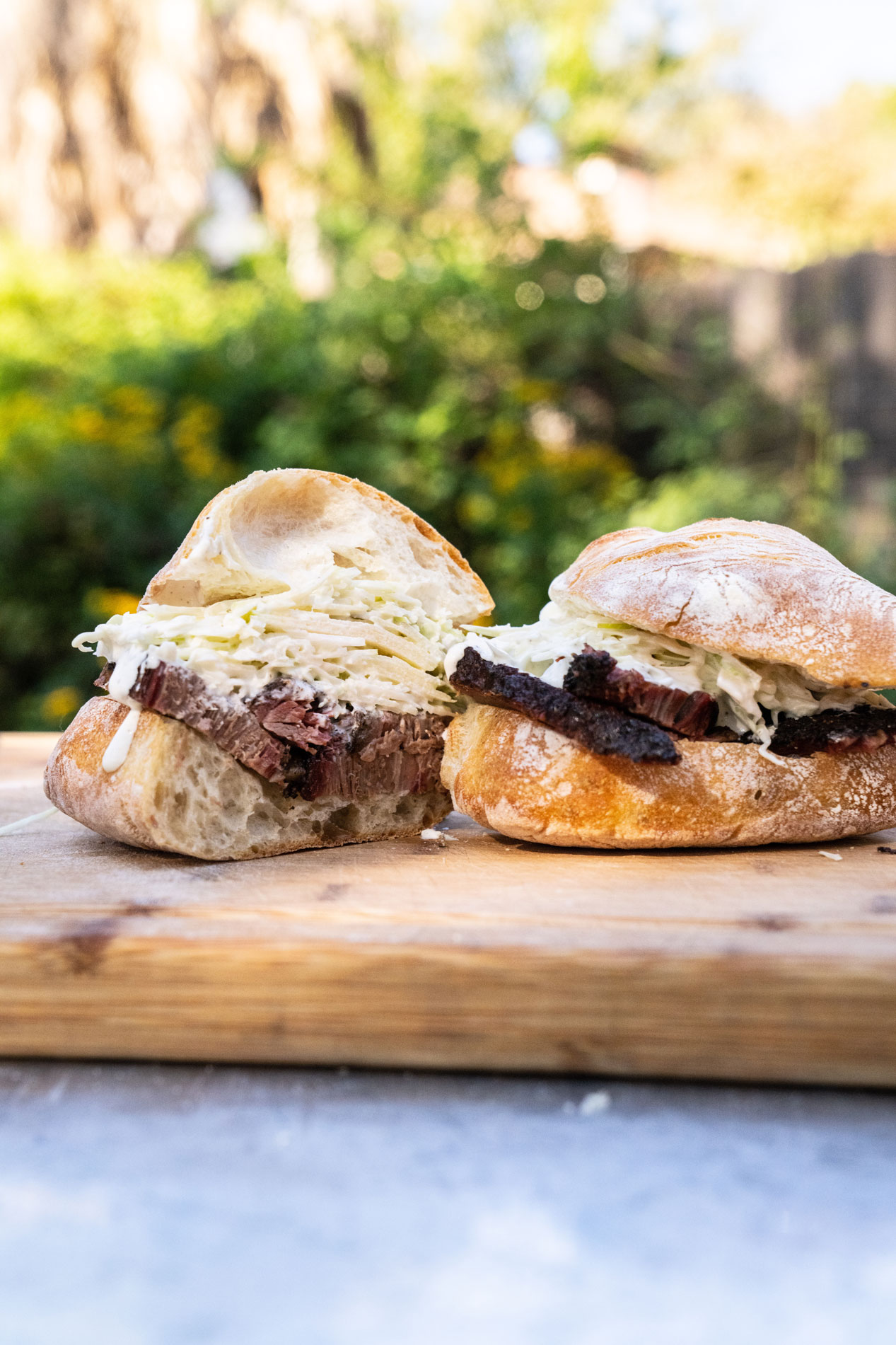 To make the sandwiches, split the ciabatta rolls horizontally. Pile about ½ cup of slaw on the bottom roll, top with brisket slices, as desired, and the top of the bun. Give the sandwich a gentle “squish” to meld the flavors, slice in half and serve.