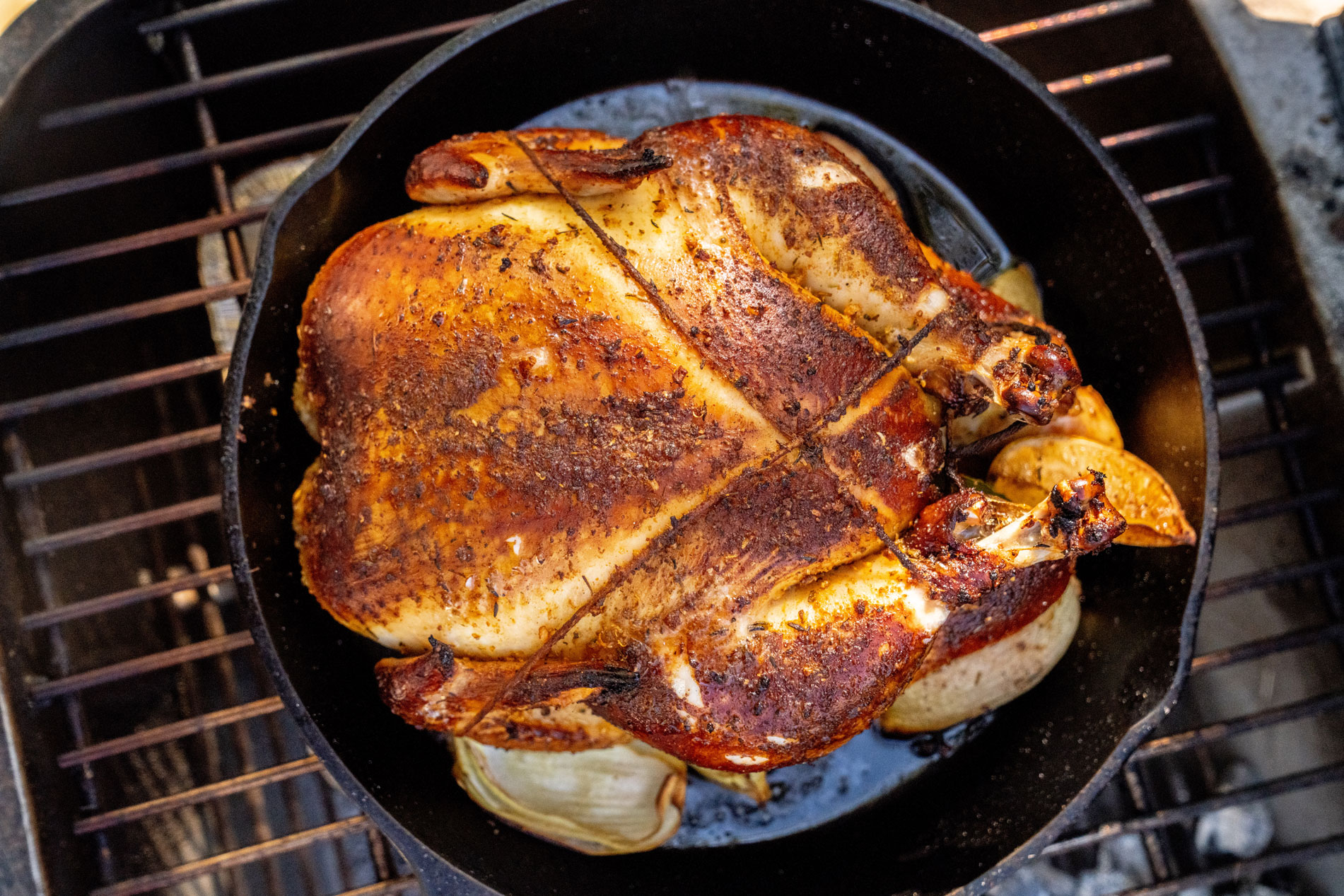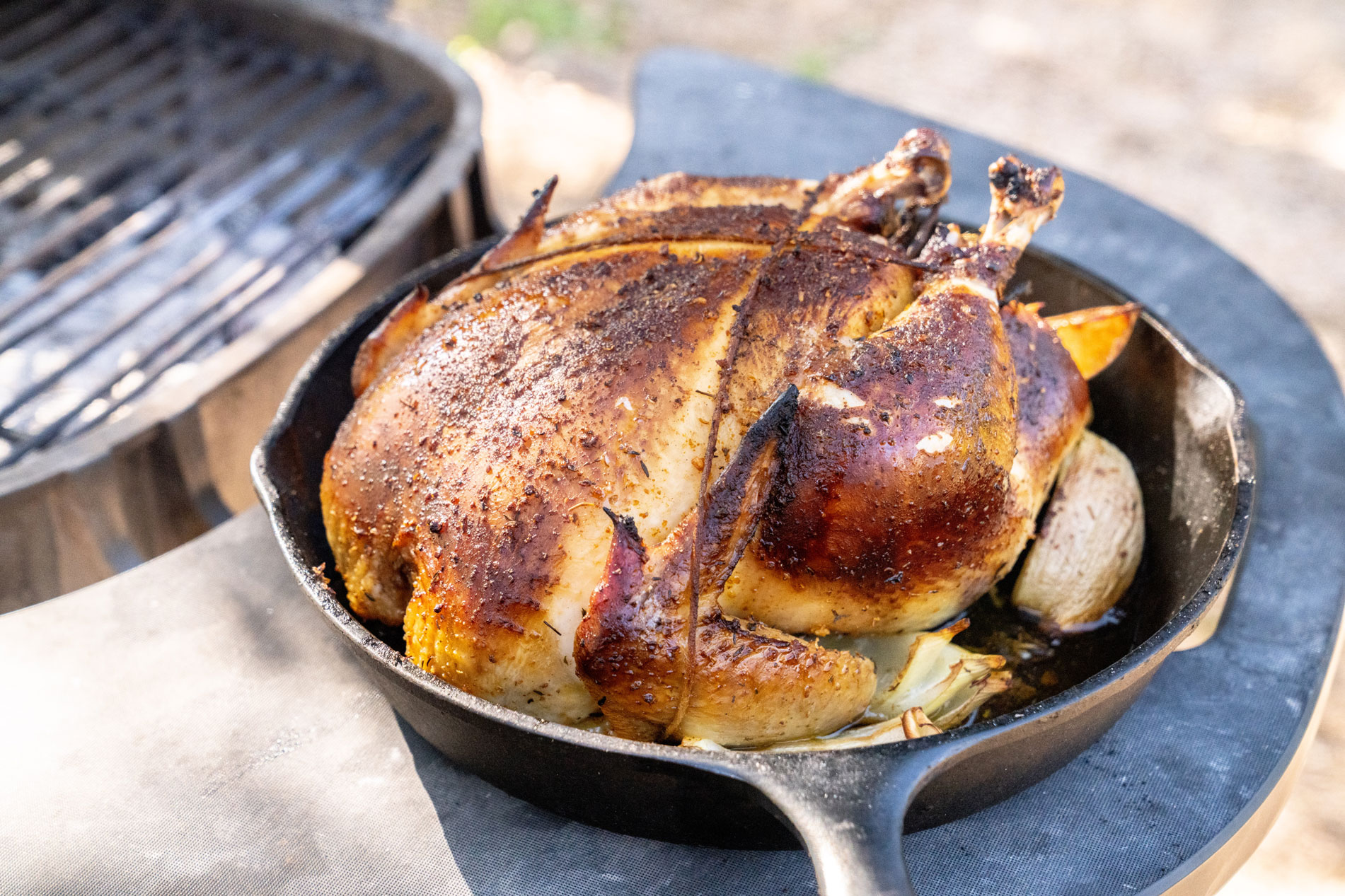 When the fire begins to produce a steady stream of smoke, place the skillet over the drip pan, close the grill, vent the grill for smoking and cook for 45 minutes to an hour (rotating the skillet 180 degrees every 15 minutes), until an instant-read thermometer inserted into the thickest part of the chicken thigh reads 175℉. Remove from heat and allow the chicken to rest at least 15 minutes before carving.
