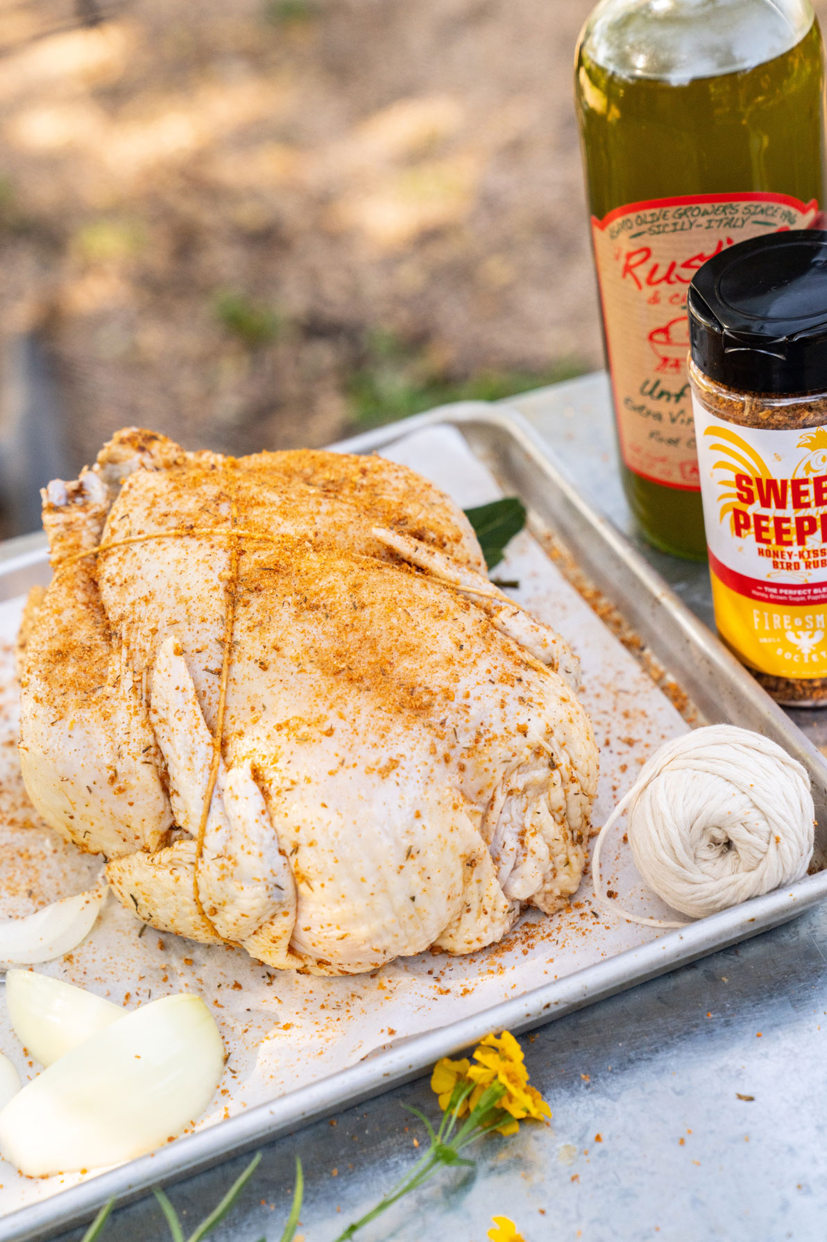 An hour before cooking, drizzle the chicken with enough olive oil to lightly coat, and generously season the inside and outside of the chicken with