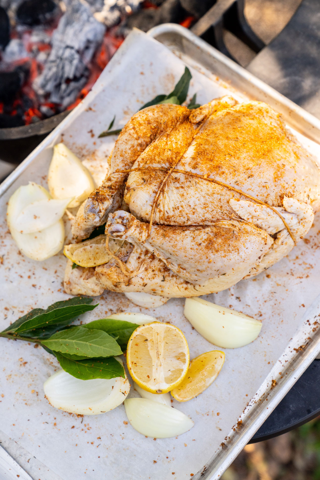 Position the chickens on a work surface, breast-side up, with the legs pointing toward you. Center a 2-foot piece of butcher’s twine under the back of the bird, and bring both sides around the wings (securing them to the carcass) and up and around the legs (securing them together). Place the chicken in a large, cast iron skillet (tucking any leftover onion wedges or herb sprigs underneath, and set aside to marinate at room temperature for 1 hour.