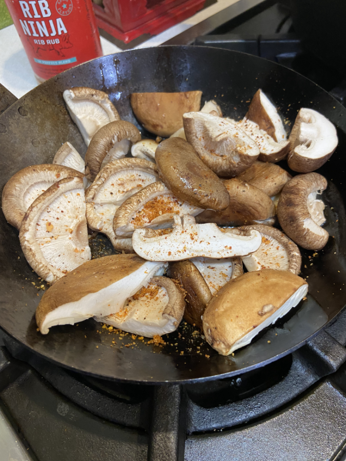 Heat the sesame oil in a medium skillet over medium-high heat. When the oil is hot and shimmering, add the shiitake mushrooms, sprinkle with Rib Ninja seasoning, and cook, stirring and flipping, until crisp and deeply browned; set aside.