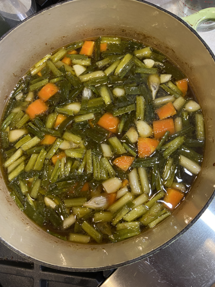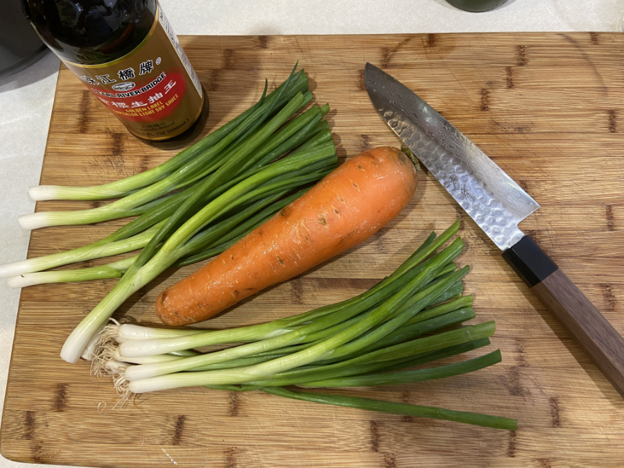 To make the broth, combine the scallions, carrots, garlic, ginger, kombu, turkey stock, and bonito flakes, sake, mirin, and soy sauce in a large heavy pot, and bring the mixture to a boil over high heat. Reduce the heat and simmer, skimming occasionally, until stock is reduced by one third (about an hour). (*Remove the kombu after it has simmered for 15 minutes, so it doesn’t become slimy.) Strain stock into a clean pot. Taste and add additional mirin, for sweetness, or soy sauce, for saltiness, as desired.
