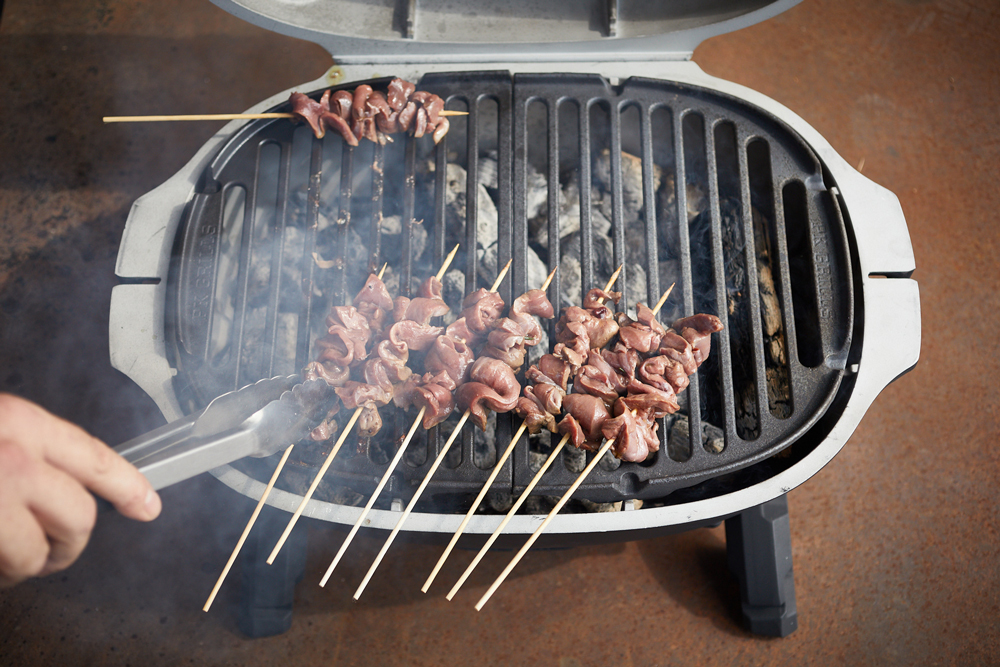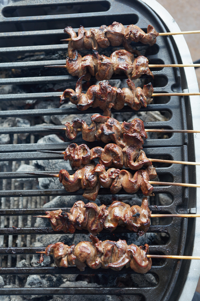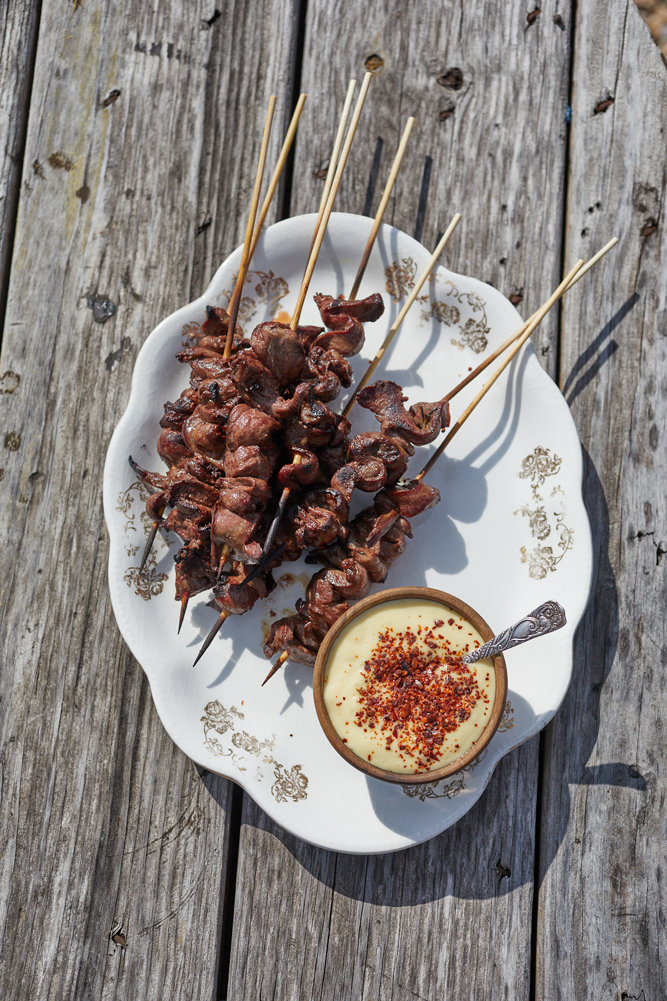 Grilled Wild Boar Heart Skewers with Pine Nut Aïoli