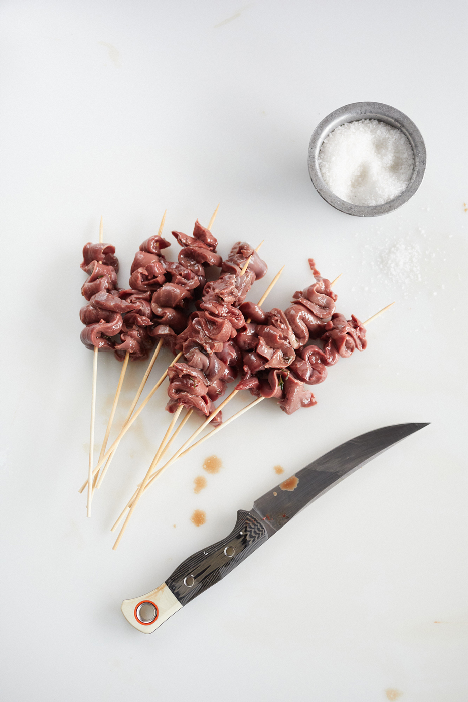 Season the heart with salt and pepper. Combine all of the marinade ingredients in a small bowl and marinate the strips of heart for at least 2 hours or up to a day, then thread them onto the soaked skewers.
