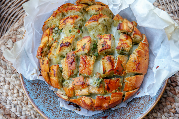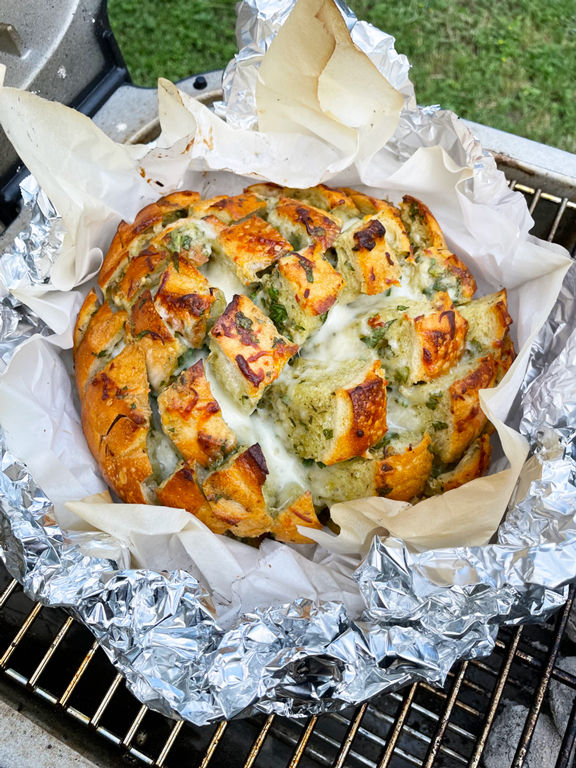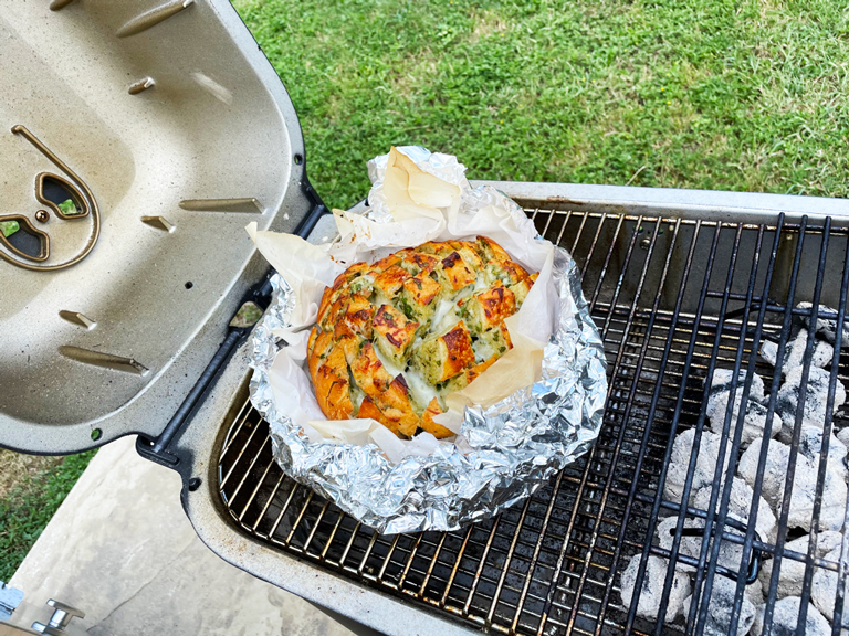 Place the foiled loaf on the indirect side of the grill grate (not directly above the coals) and close the lid. Cook for 15-20 minutes. After this time, gently peel back the foil and paper to reveal the top of the loaf (it will be hot, use high heat gloves or tongs), close the lid and cook a further 8-10 minutes.