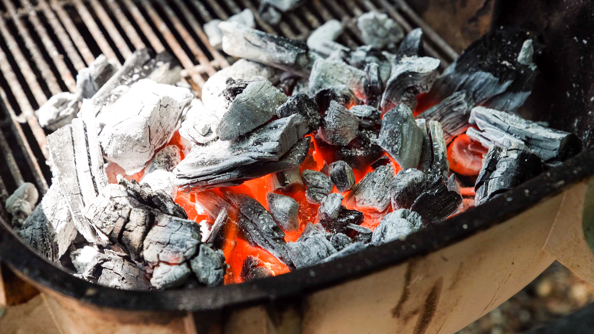 When the coals are glowing red and covered with a fine gray ash, use tongs to remove the cooking grate and place a drip pan with 1 inch of warm water on the side with no coals, and add a few wood chunks. Carefully wipe the grill grates, then carefully wipe with a lightly oiled towel again.