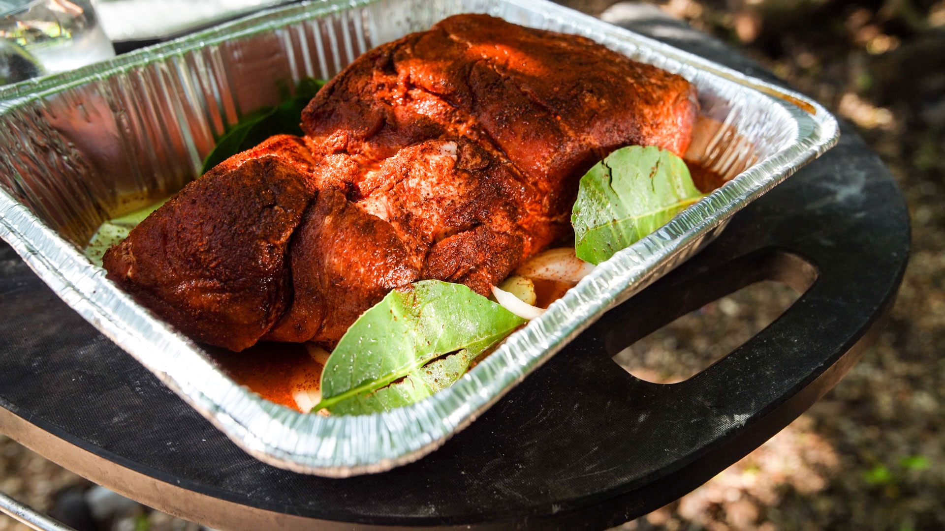 Meanwhile, place the onion, garlic, and bay leaves in a disposable aluminum pan that’s large enough to hold the pork.