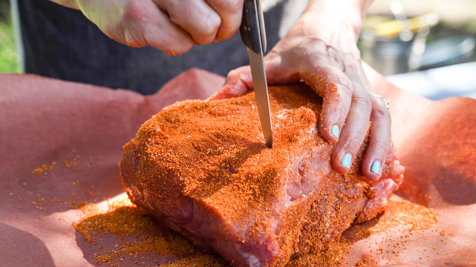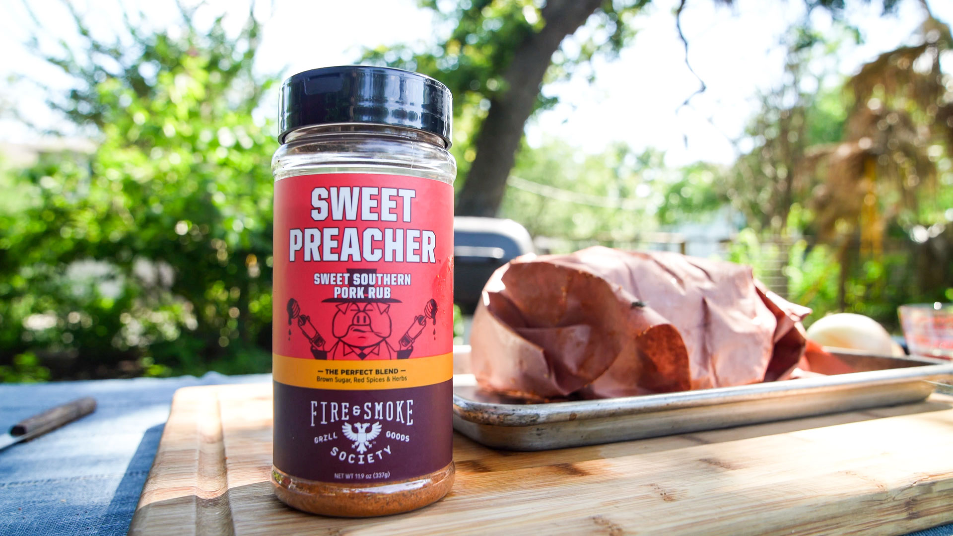 Place the pork in a rimmed baking sheet lined with foil or butcher’s paper. Sprinkle the meat with Sweet Preacher and use your hands to evenly coat all sides. Allow the pork to marinate at room temperature for 1 hour, or tightly wrap with plastic and refrigerate up to 2 days in advance.