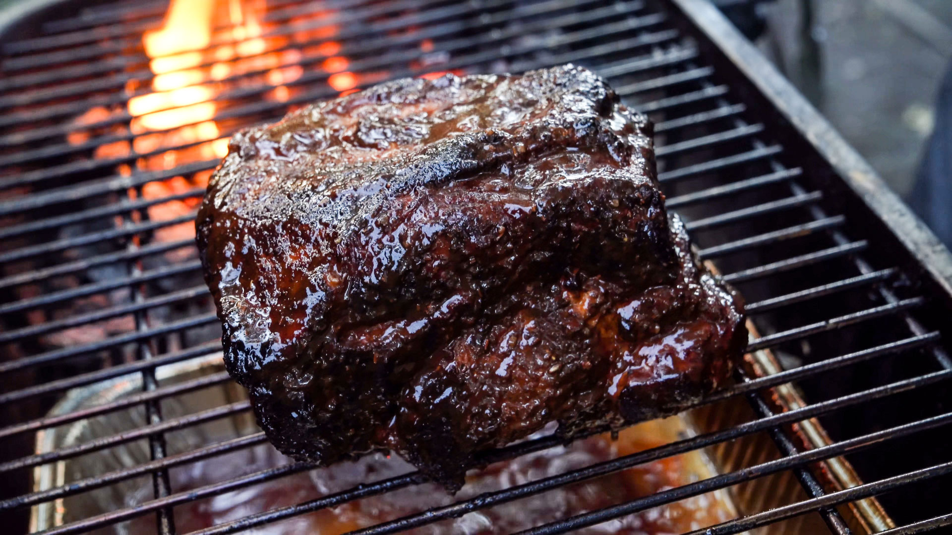 When the fire begins to produce a steady stream of smoke, place the pork over indirect heat, close the grill, vent the grill for smoking, and smoke for 6 to 8 hours, until the meat shreds easily with a fork and an instant-read thermometer inserted into the center of the roast reads 200°F- 205°F. After the first two hours of cooking, use a brush or mop to moisten the exterior of the meat with BBQ sauce. Add additional hot coals or wood chunks as needed to maintain a steady temperature of 250-275°F.