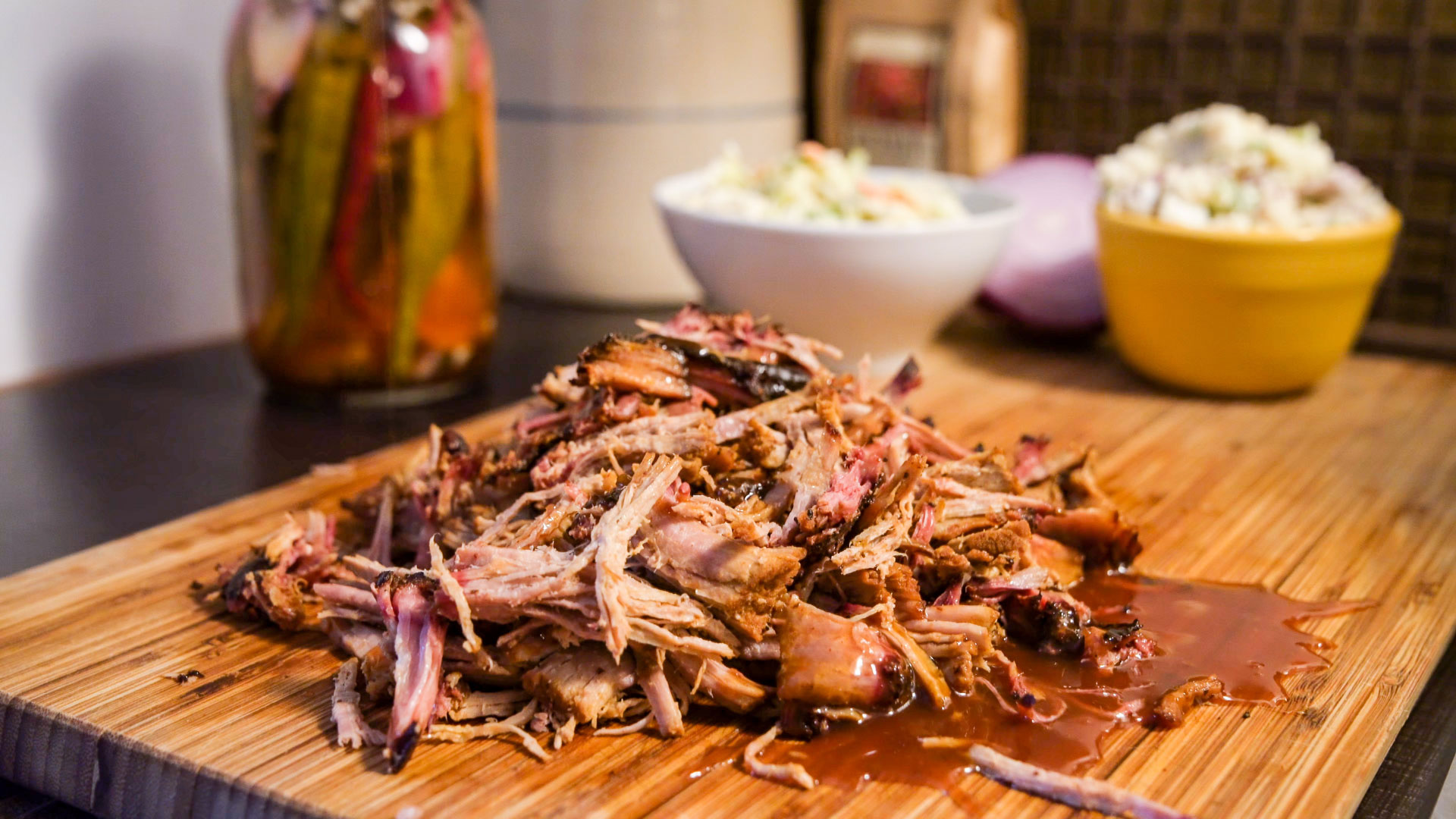 Remove the pork from the heat and allow it to rest in a baking dish (to capture its juices) for at least 15 minutes, or up to 30 minutes before serving. Use two forks to shred the pork, tossing it with its juices; serve as desired, with additional bbq sauce on the side.