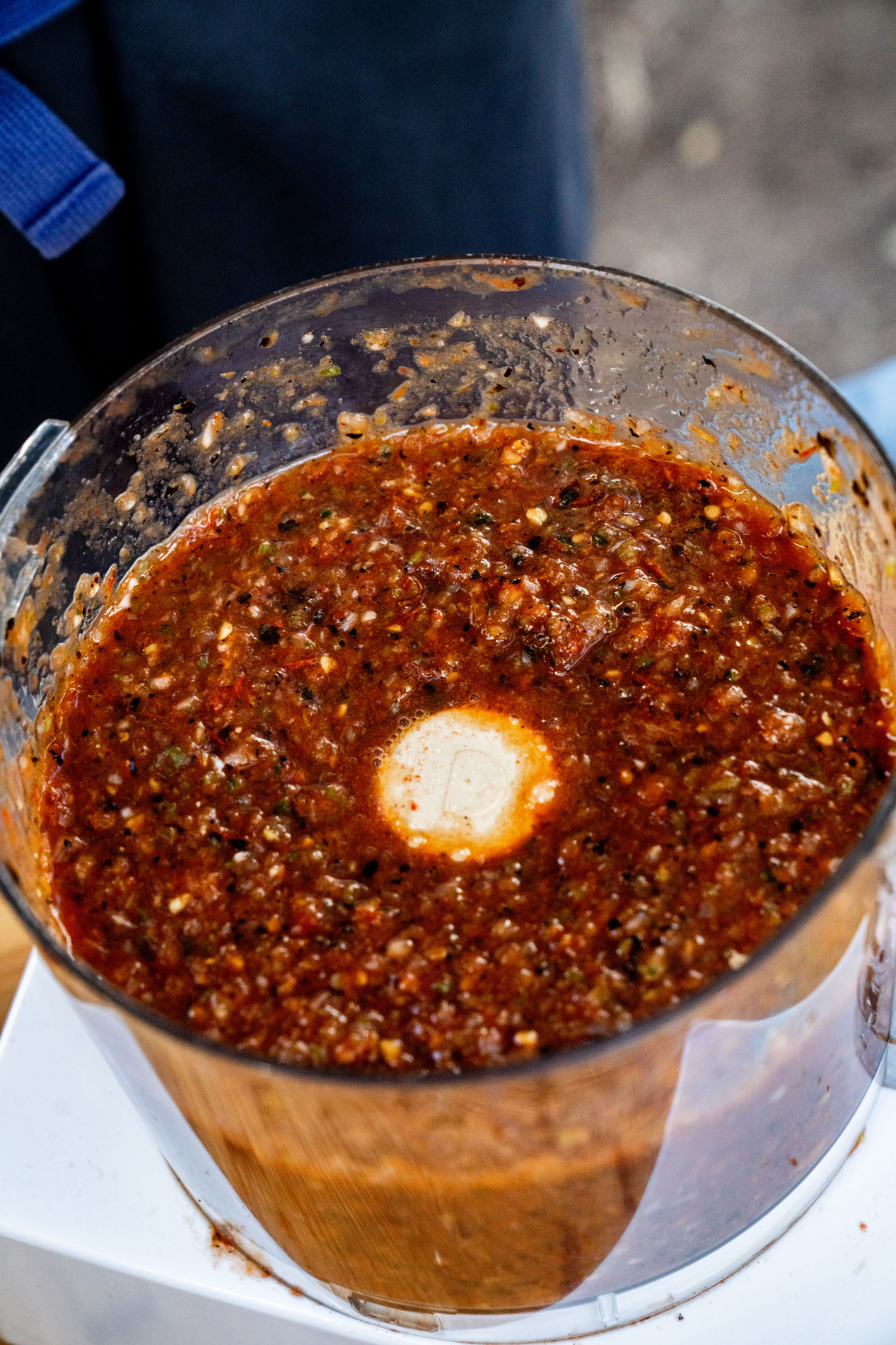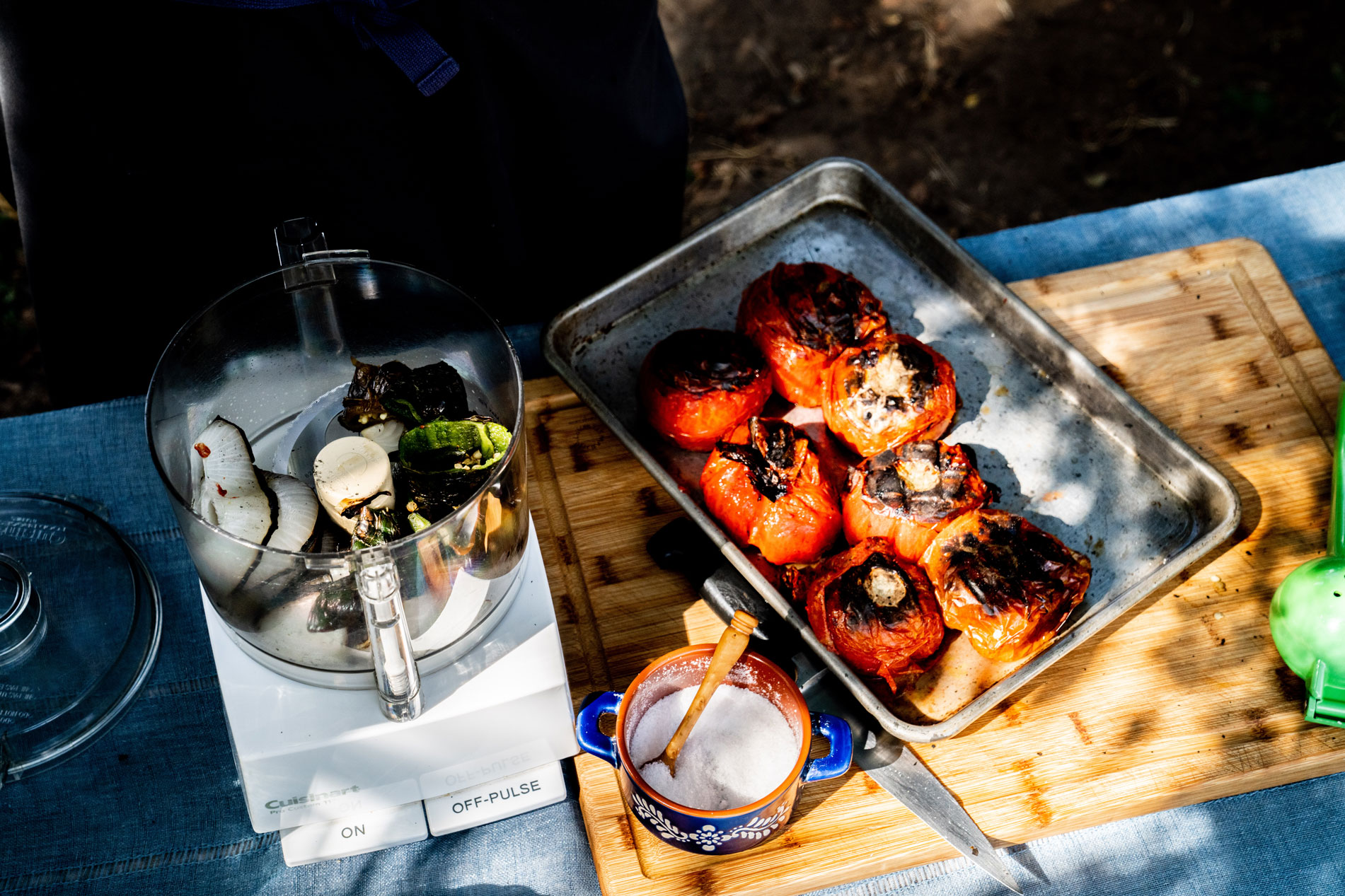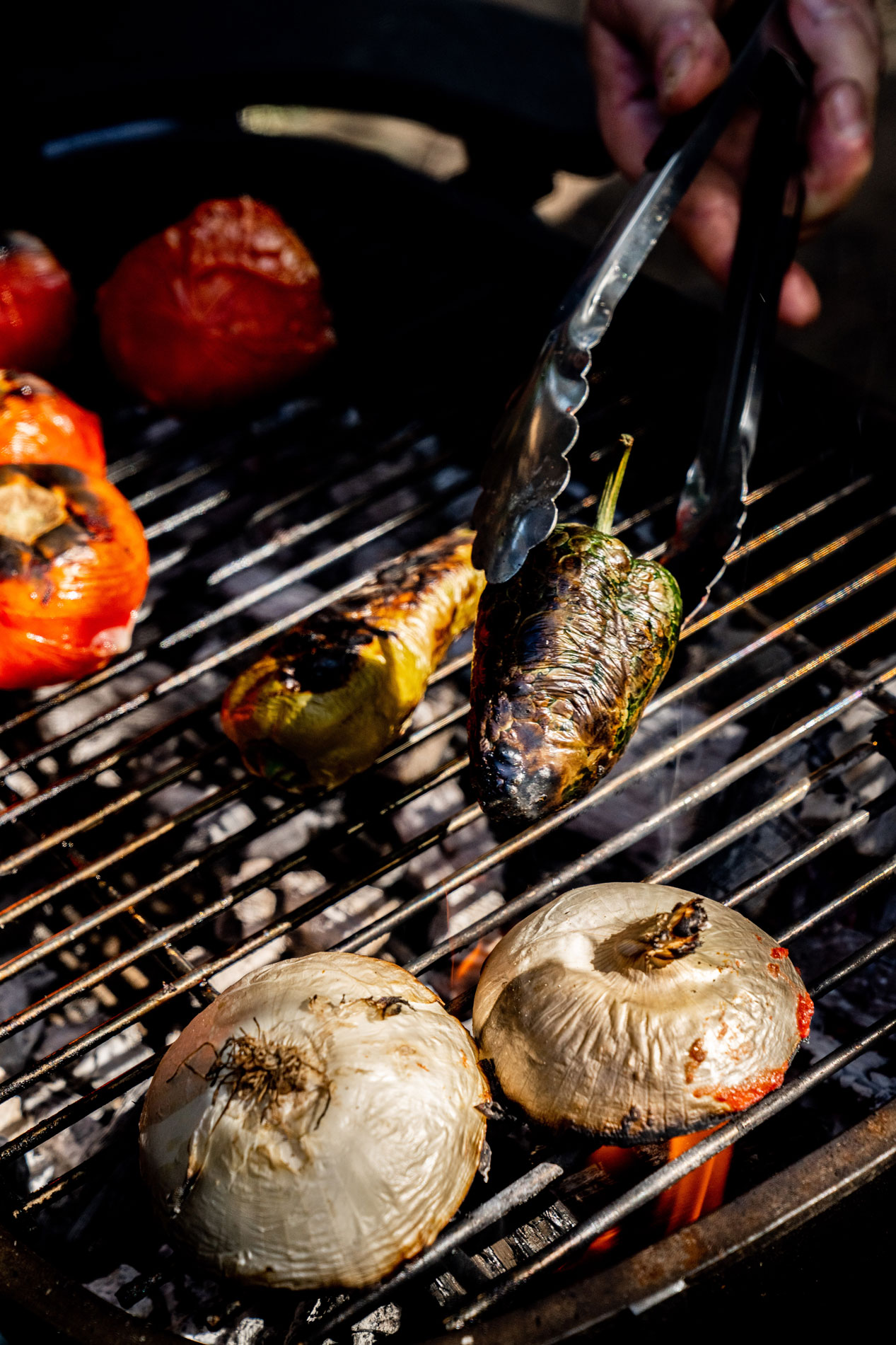 Char the tomatoes on all sides until very soft and the skins are blackened. Char the cut sides of the onion until very black. Turn the peppers, blistering them on all sides and softening them. Toast the garlic in its skin until well-browned and fragrant. This could take up to 20 minutes. Once done, remove ingredients to a pan and allow to cool off a little.