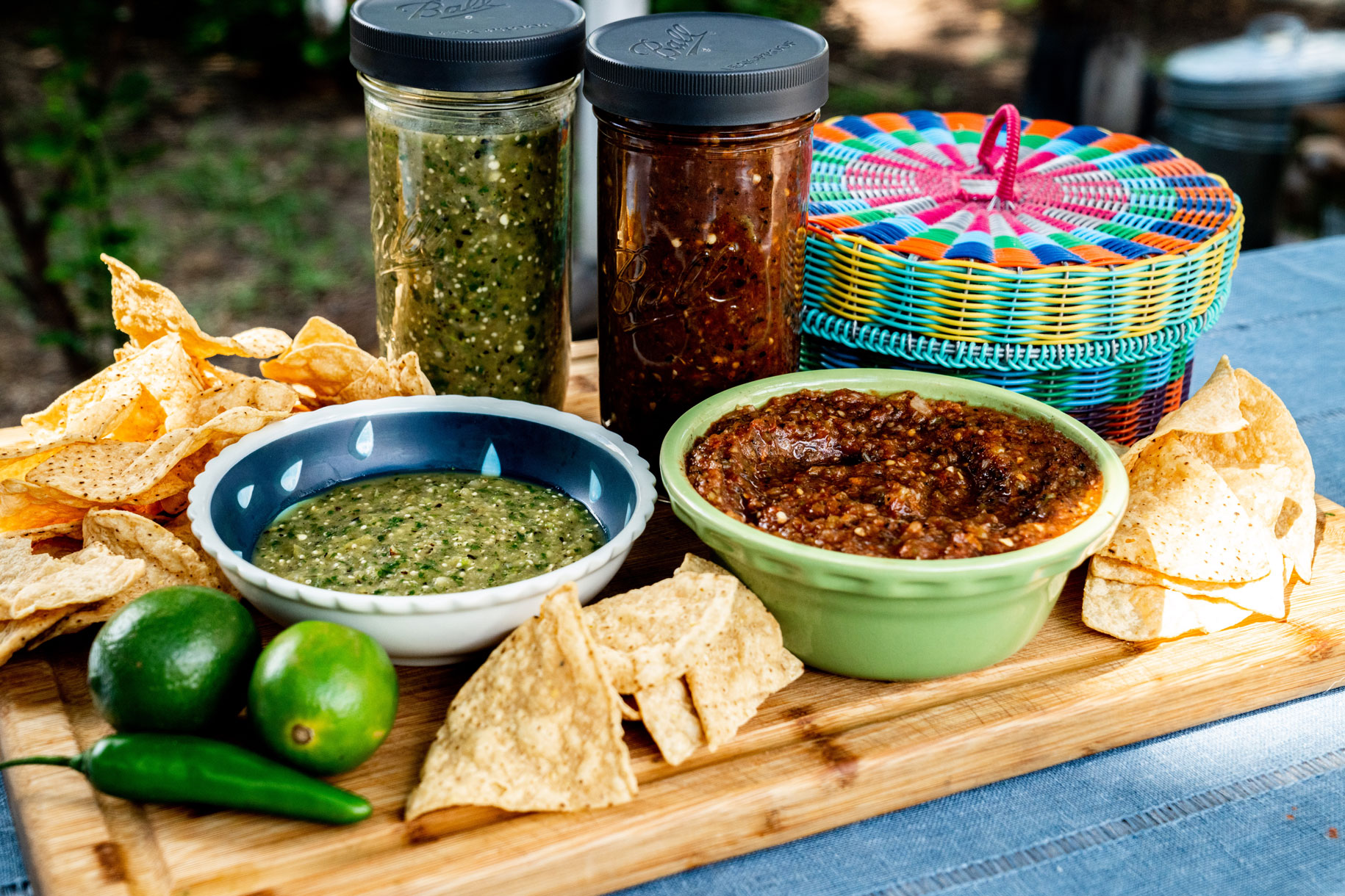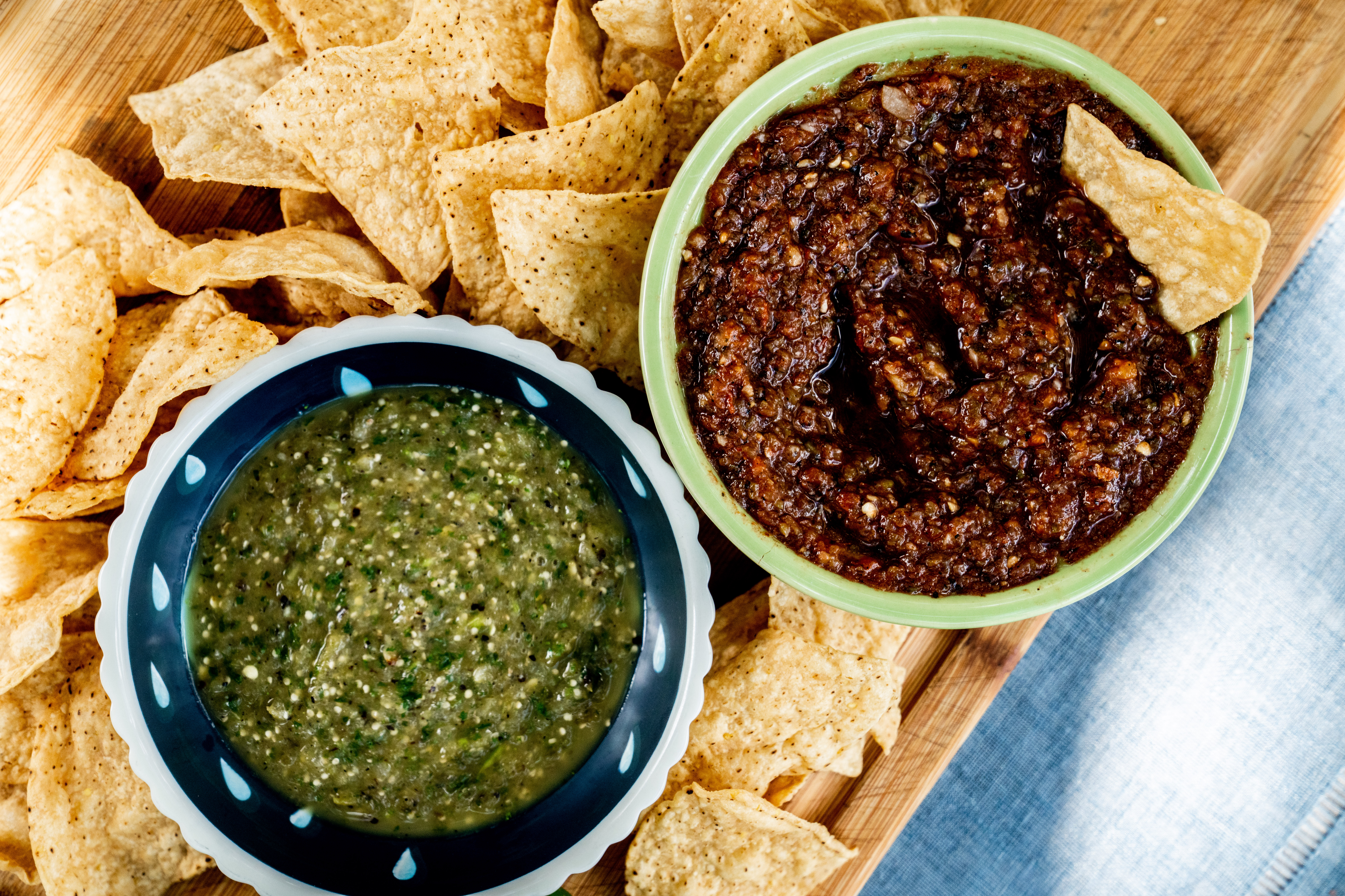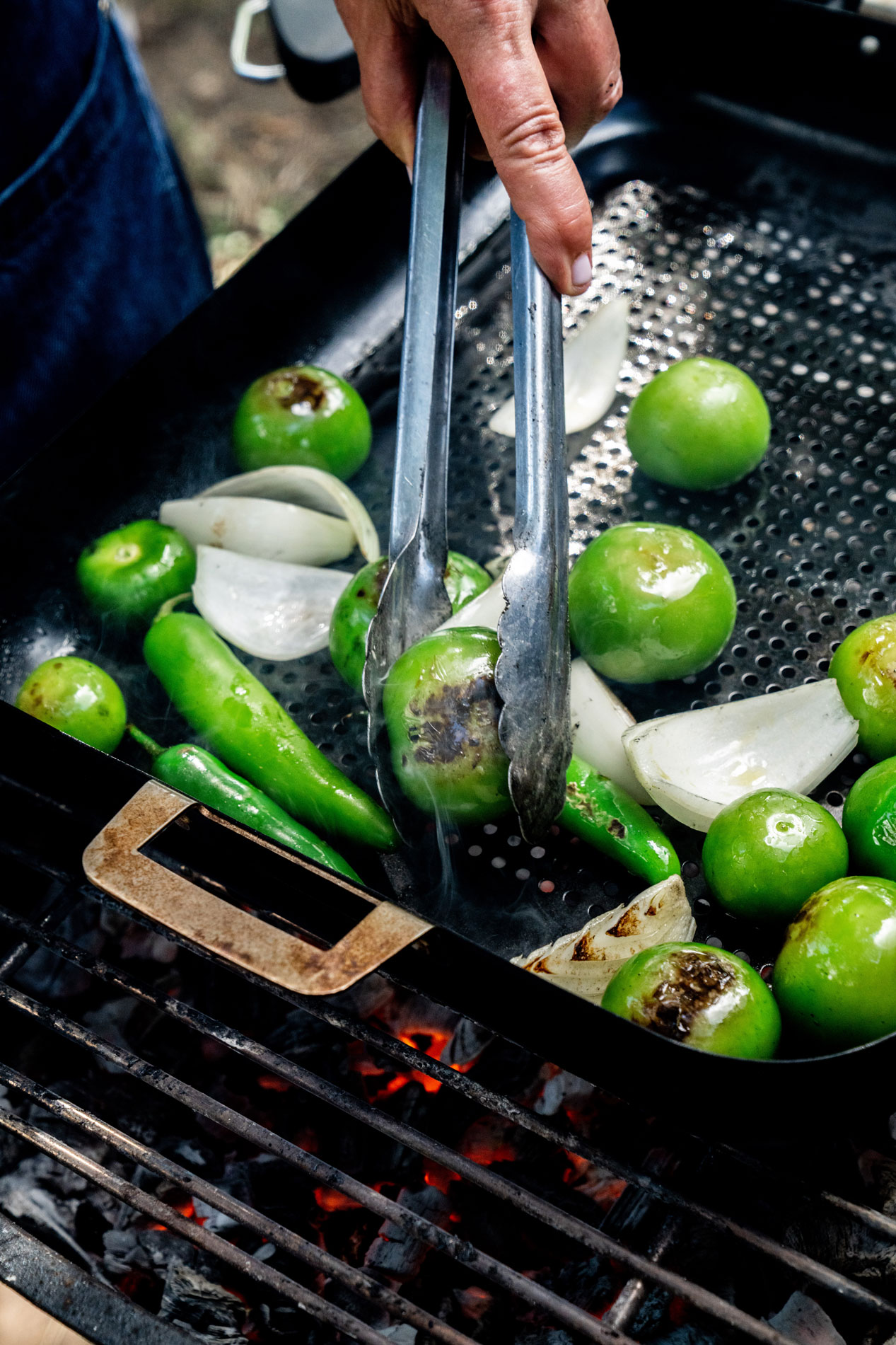 Paula: This salsa is worth building a fire for, but the preparation is also a great way to make the most of lingering heat after you’ve fired up dinner. Giving tomatillos, onions, chilies, and garlic a quick spin over the fire creates a tangy salsa verde with impressive depth and heat (for a milder salsa, remove the seeds before blending). Serve this salsa with breakfast tacos, alongside guac and queso, or thin it with chicken stock to make a sauce for enchiladas.